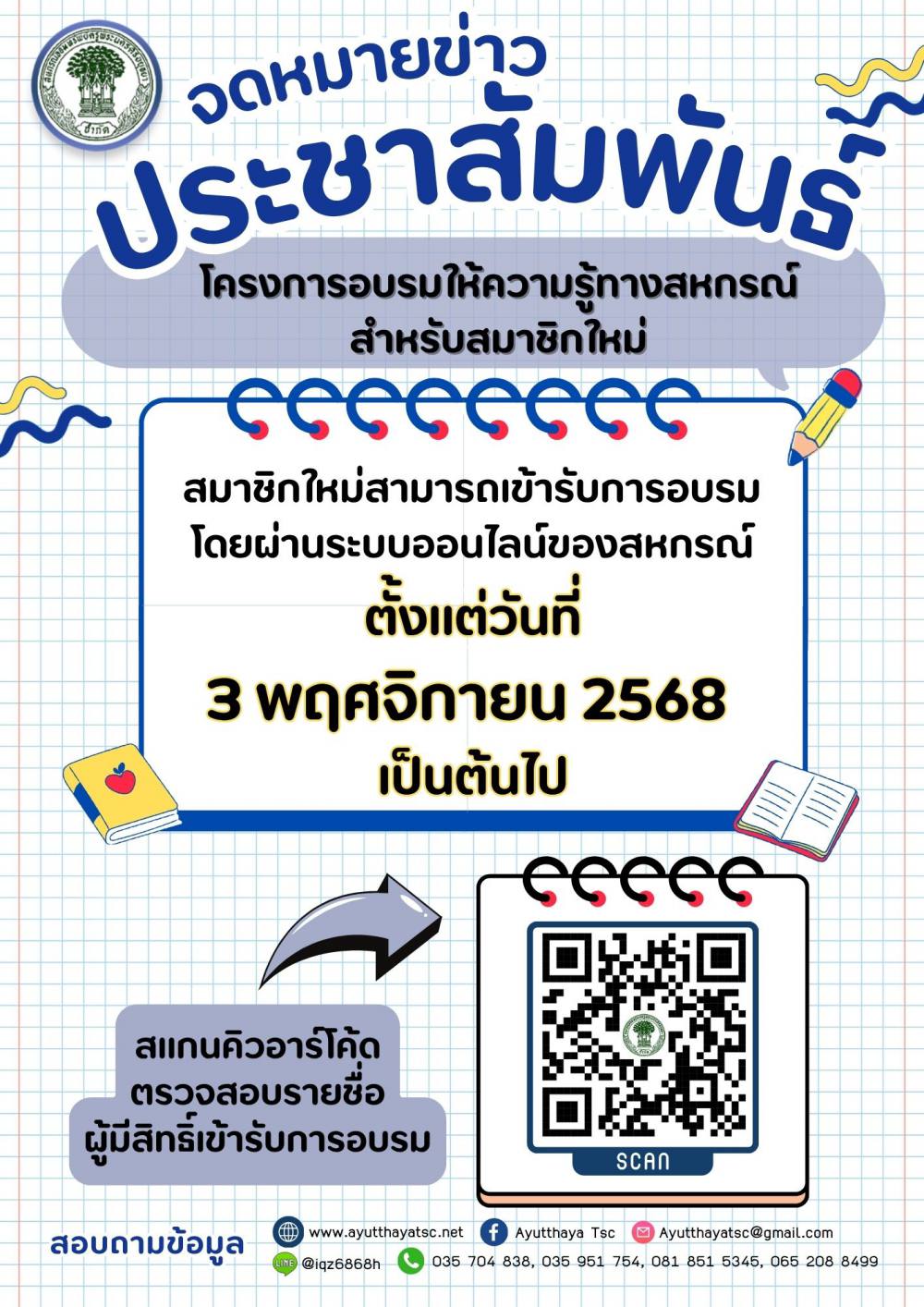 สหกรณ์ออมทรัพย์ครูพระนครศรีอยุธยา จำกัด ประกาศ เรื่อง โครงการอบรมให้ความรู้ทางสหกรณ์แก่สมาชิกใหม่ โดยผ่านระบบโปรแกรมของสหกรณ์ฯ ในวันจันทร์ที่ 3 พฤศจิกายน 2568 (
