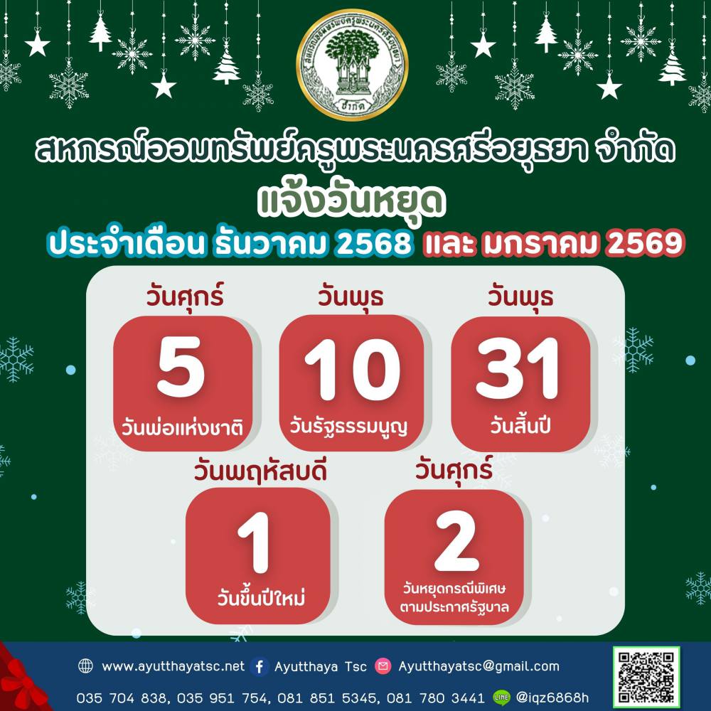 สหกรณ์ออมทรัพย์ครูพระนครศรีอยุธยา จำกัด แจ้งวันหยุดประจำเดือน ธันวาคม 2568 และเดือนมกราคม 2569