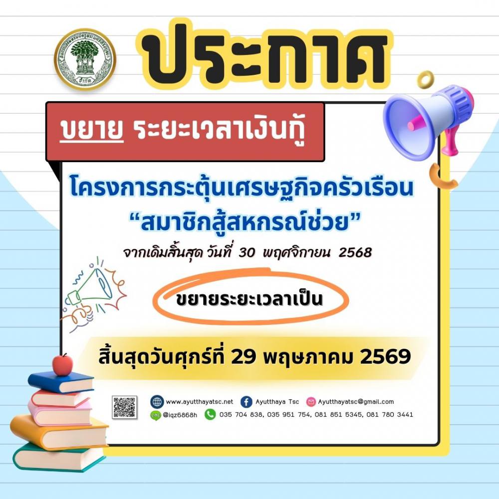 คณะกรรมการดำเนินการ ชุดที่ 65 ในคราวประชุมครั้งที่ 14/2568 เมื่อวันจันทร์ที่ 8 ธันวาคม 2568 ให้ขยายระยะเวลายื่นกู้เงินกู้โครงการกระตุ้นเศรษฐกิจครัวเรือน "สมาชิกสู้สหกรณ์ช่วย" เป็นสิ้นสุดวันที่ 29 พฤษภาคม 2569 (