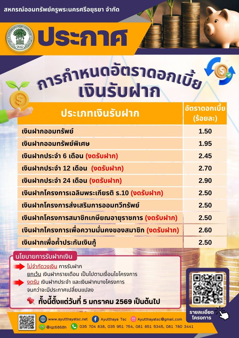 ด้วยสหกรณ์ออมทรัพย์ครูพระนครศรีอยุธยา จำกัด มีมติกำหนดอัตราดอกเบี้ยเงินรับฝากของสหกรณ์ทุกประเภท (
