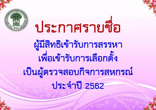 ประกาศรายชื่อผู้มีสิทธิเข้ารับการสรรหาเพื่อเข้ารับการเลือกตั้งเป็นผู้้ตรวจสอบกิจการสหกรณ์ ประจำปี 2562