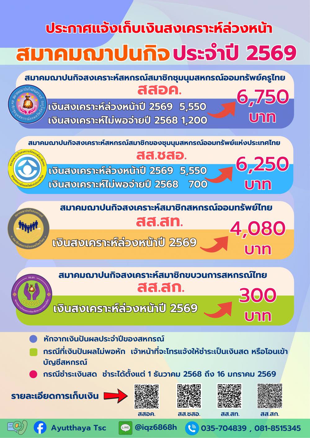 สหกรณ์ออมทรัพย์ครูพระนครศรีอยุธยา จำกัด แจ้งเก็บเงินสงเคราะห์ล่วงหน้า ของสมาคมฌาปนกิจสงเคราะห์ สส.อค., สส.ชสอ., สส.สท., สส.สก ประจำปี 2569
