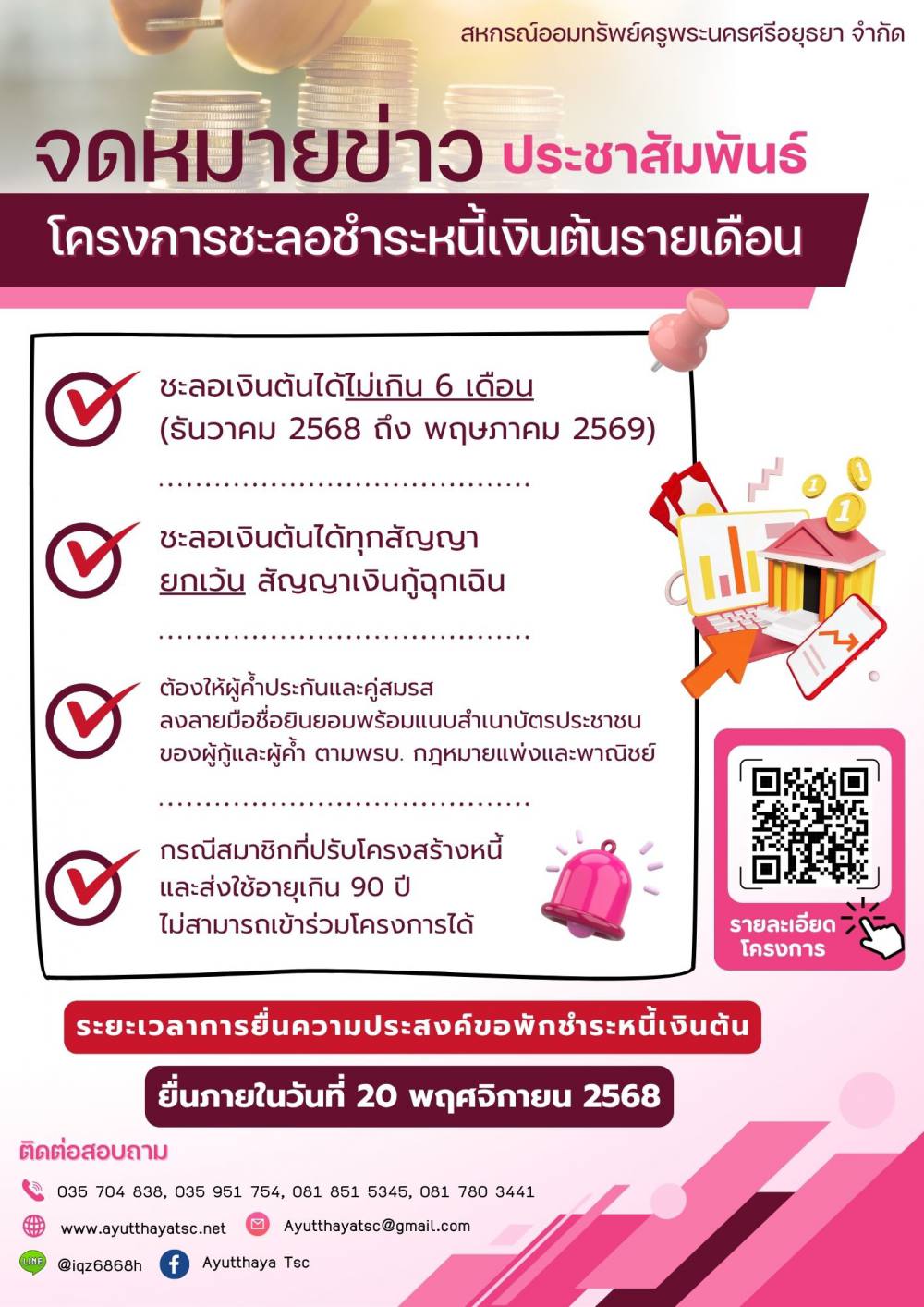 สหกรณ์ออมทรัพย์ครูพระนครศรีอยุธยา จำกัด มีมติจัดทำโครงการช่วยเหลือสมาชิก โดยดำเนินการมาตรการพักชำระหนี้ เป็นระยะเวลา 6 เดือน (เดือน ธันวาคม 2568 - เดือน พฤษภาคม 2569) สามารถดาวน์โหลดแบบฟอร์มได้ที่หน้าเว็บไซต์สหกรณ์ฯ (