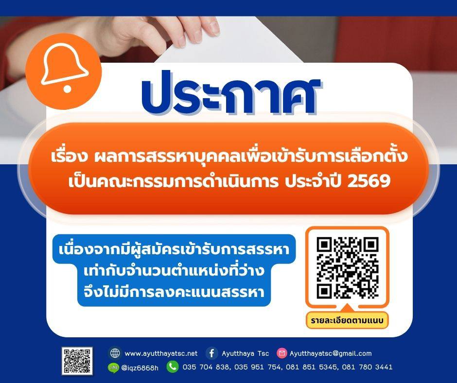สหกรณ์ออมทรัพย์ครูพระนครศรีอยุธยา จำกัด ประกาศผลการสรรหาบุคคลเพื่อเข้ารับการเลือกตั้งเป็นกรรมการดำเนินการ ชุดที่ 66 ประจำปี 2569 (