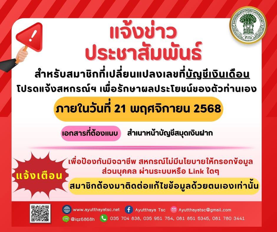 แจ้งข่าวประชาสัมพันธ์สมาชิกที่เปลี่ยนแปลงเลขที่บัญชีเงินเดือน โปรดแจ้งสหกรณ์ฯ เพื่อรักษาผลประโยชน์ของตัวท่านเอง (ต้องมาติดต่อแก้ไขข้อมูลด้วยตนเองเท่านั้น ภายใน 21 พฤศจิกายน 2568)